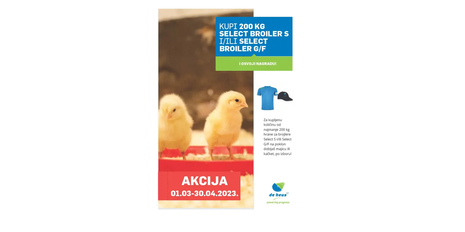 Za kupljenu količinu od najmanje 200 kg hrane za brojlere Select S i/ili Select G/F, kupci u maloprodajama dobijaju na poklon De Heus majicu ili kačket, po izboru!