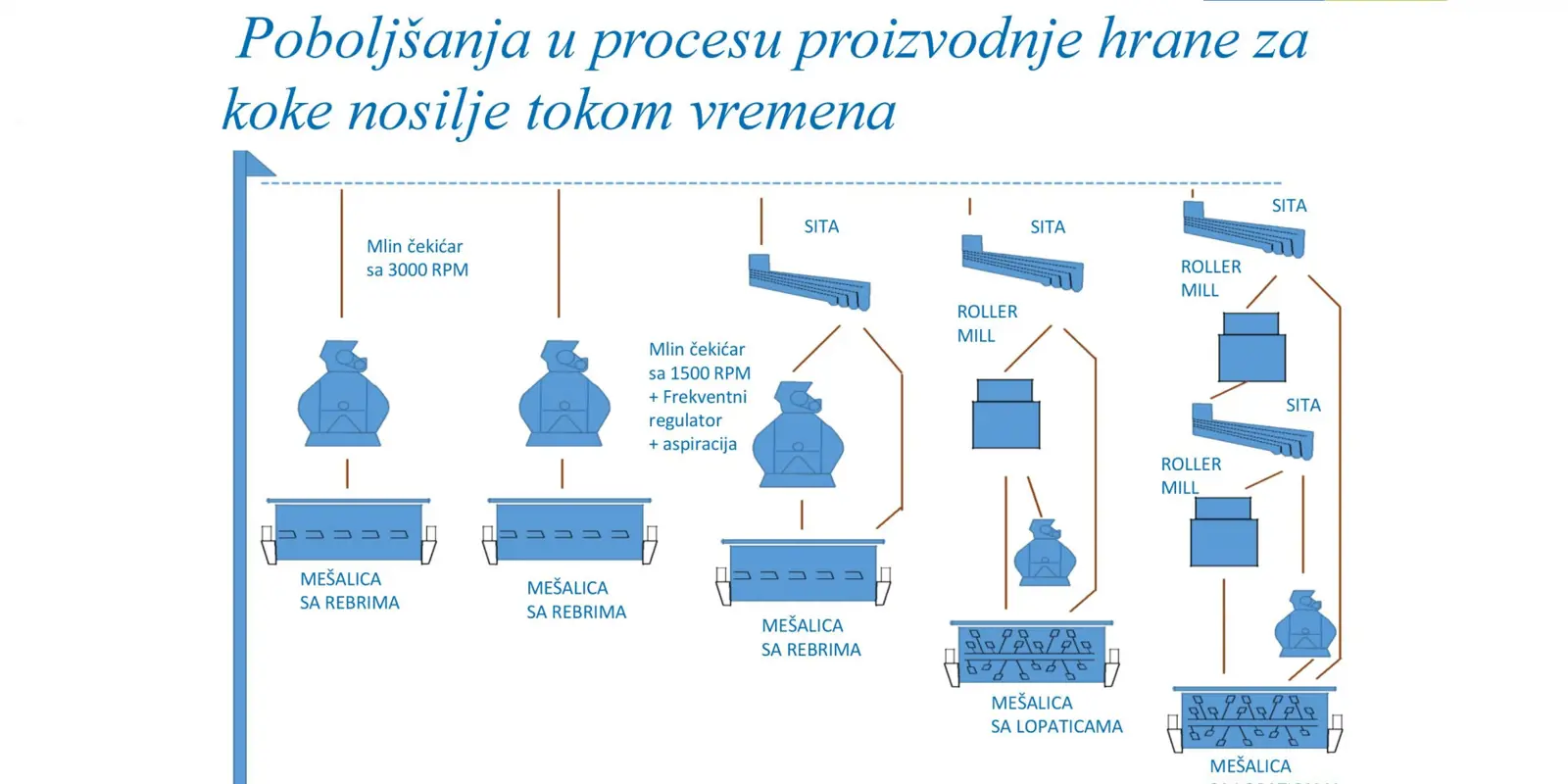 Konkretno, kada govorimo o hrani za koke nosilje, poboljšanja u proizvodnji tokom vremena prikazana su na sledećoj skici: