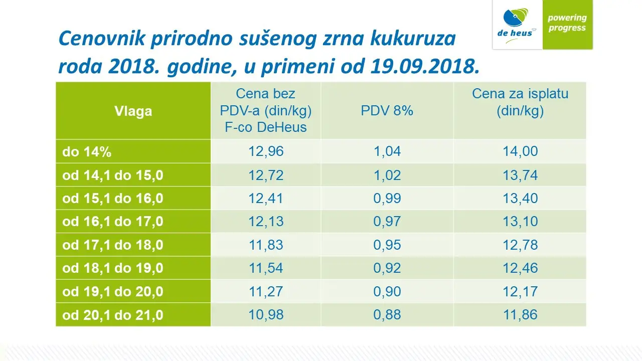 Kukuruz sa preko 21% vlage i 2% primesa se neće primati u "De Heus" DOO.