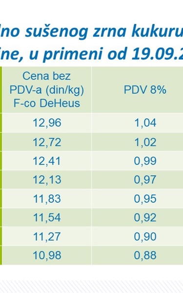 Kukuruz sa preko 21% vlage i 2% primesa se neće primati u "De Heus" DOO.