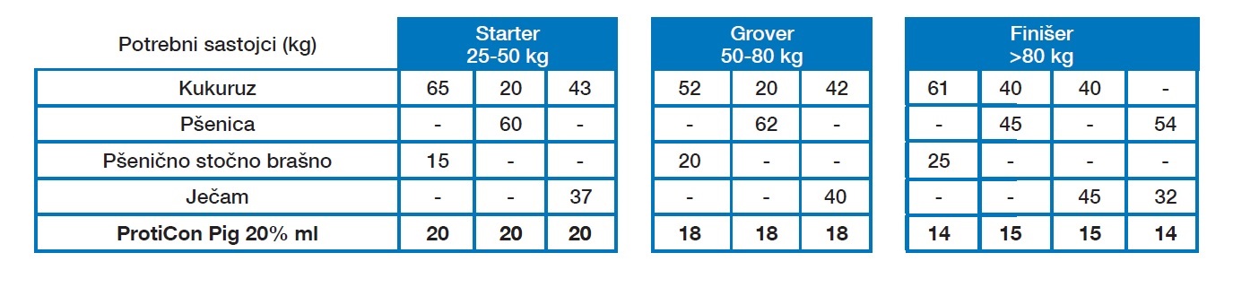 Predlozi za mešanje ProtiCon Pig 20% za dobijanje kompletne hrane za tov životinja u različitim fazama tova: