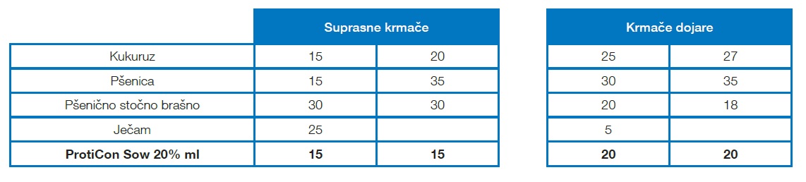Ova koncentrovana predsmeša se koriti za suprasne krmače koje se hrane kombinacijom sopstvenih žitarica i profesionalne dopunske smeše.